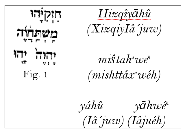 Estos nombres de Iâjuéh aparecen como partes de nombres personales, llamados “componentes teofóricos”, como prefijos y sufijos, pero la יה aparece solamente como sufijo. En otras ocasiones aparece יה sola o precediendo hwhy como un “praenomen” (prenombre), que identifica al Hijo específicamente en el Tenákh (un acrónimo hebreo para Ley, Profetas, y Escrituras, que nosotros llamamos escrituras pre-advenimiento). Estos componentes teofóricos, pronunciados IÂJU (i.e., -iājû, en tales nombres como JizqîIājû [“Ezequías”]), se consideran, en la lingüística hebrea, la forma normal acortada de un verbo imperfecto como iājuéh, que es la forma corta pretérita o yusiva de este Verbo. La forma corta del imperfecto tiene dos funciones: uno del tiempo pasado (pretérito), “Él causó ser existido,” y yusivo (comandante tercera persona), “Él causa ser existido”; sin embargo, no trates de traducirlo adentro de un nombre personal: Ej. Iâjuwtsâthâ´q debe ser traducido “Justicia de Iâjuéh”. Existe un significado más profundo para esta forma corta: Como a veces los vemos escrito combinados aún todavía, en escrituras hebreas, Iâ´ju Iâjuéh (יָ֥הֻ יָהְוֶ֥ה), esta forma corta (completada en el pasado, sin embargo, la voz comandante) junta a la forma imperfecta (continuando, no completada), como un nombre dual, esta forma dual representa al Hijo, como siendo completado en el pasado, y la Voz comandante de Iâjuéh, y Aquel (n.), el Iâjuéh continuando no completado Quién Se define como ‘aquellos’, todo Su número de luces viniendo a existir, aunque un número es finito y perfecto, haciéndolo mediante el Hijo. Por eso, los componentes teofóricos de Su nombre se refieren a Su Hijo completado comandante, la Personificación de Iâjuéh, Aquello (n.) siendo aquellos viniendo a existir. Aplicando este conocimiento al entendimiento del nombre que contiene esta forma acortada en traducción, Ej. Iâjuwtsâthâ´q, traducido como “Justicia de Iâjuéh”, se referiría a la Justicia del Hijo completado comandante siendo Iâjuéh. Por favor nota que lógicamente, desde que estos componentes teofóricos todos son la misma forma acortada legítima del nombre de Iâjuéh, esto explica el por qué debería siempre sonar igual, no importa cómo lo hayan degenerado los escribas las letras que usaron, y aunque aparezca al principio o al final de un nombre. Otro ejemplo de esta relación de forma corta/forma larga es el verbo “hacer profunda reverencia”, que en el imperfecto es lliŝtajauéh, mientras la forma imperfecta acortada (para pretérito o yusivo) es lliŝtájû. En otras palabras, lliŝtájû es para lliŝtajauéh como iájû es para iājuéh. (Fig. 1)