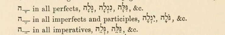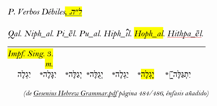 Algunos seudolingüistas que reniegan al nombre de Iâjuéh están alegando que esta forma que termina en –éh de ser “femenino” para excusar a que lo cambien al invento propio de ellos, pero nota que la misma referencia, Paradigma P del Gesenius Hebrew Grammar, muestra que la conjugación femenina del mismo tipo usaría el ejemplo תָּגְלֶה para formar un rendimiento femenino del Verbo, תָּהְוֶה tâjuéh. Esto significa que יָהְוֶה es masculino, no femenino, y que la “forma masculina” de ellos es solamente otro nombre falso. Estos mismos seudolingüistas frecuentemente alegan que la terminación –éh es una contaminación griega y que esto no sucede en hebreo. Para aquellos estamos incluyendo del mismo Gesenius Hebrew Grammar, esta ilustración para verbos débiles que terminan en H. Nota que, en la línea media, este símbolo ה-ֶ- es lo mismo que –éh: